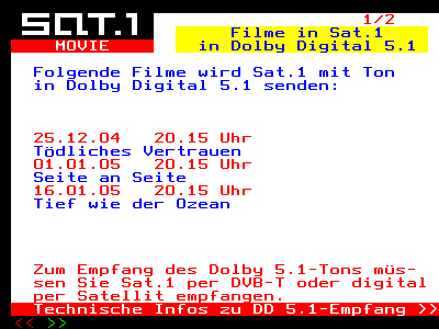 Digitaal geluidHet geluid wordt ook digitaal aangeleverd, en de meeste decoders beschikken ook over een digitale aansluiting om het geluid via een home-cinemaset door te geven. Let er op dat de decoder en versterker hetzelfde type aansluiting gebruiken, er zijn twee soorten verbinding; coax (cinch) en optisch (TOS-Link). Daar bestaan wel weer omzetters voor.